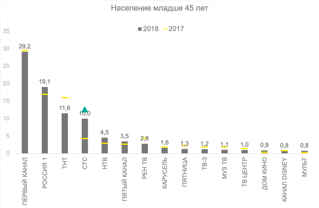 По объему аудитории среди всего населения и среди зрителей моложе 45 лет каналы в новогоднем слоте расположились следующим образом: