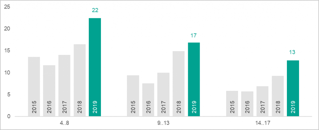 Время телепросмотра и охват ТВ отличаются в зависимости от возраста. По данным Mediascope за 2019 год с учетом дачного просмотра, дети в возрасте 4-8 лет смотрят ТВ 121 минуту в день. Охват телевидения, как и время просмотра, в этой группе наиболее высокий среди всей детской аудитории – 59% включают телевизор каждый день. С взрослением дети меньше и реже смотрят ТВ. Так, дети в возрасте 9-13 лет уделяют просмотру ТВ около 100 минут в день, а ежедневно включают ТВ – 48%. Меньше остальных телевизор смотрят подростки 14-17 лет: время просмотра – 76 минут в день, среднесуточный охват – 39%.