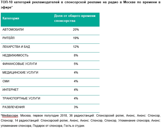 По итогам первой половины 2018 года, доля спонсорской рекламы в общем рекламном времени на радио в Москве составила более 30%. За этот период спонсорскую рекламу на столичных радиостанциях разместили 523 рекламодателя*. Спонсорство на радио выбирают, в первую очередь, автомобильные и фармацевтические компании, а также ритейлеры. Совместно на эти три категории рекламодателей приходится 51% всего времени спонсорской рекламы на столичных радиостанциях.